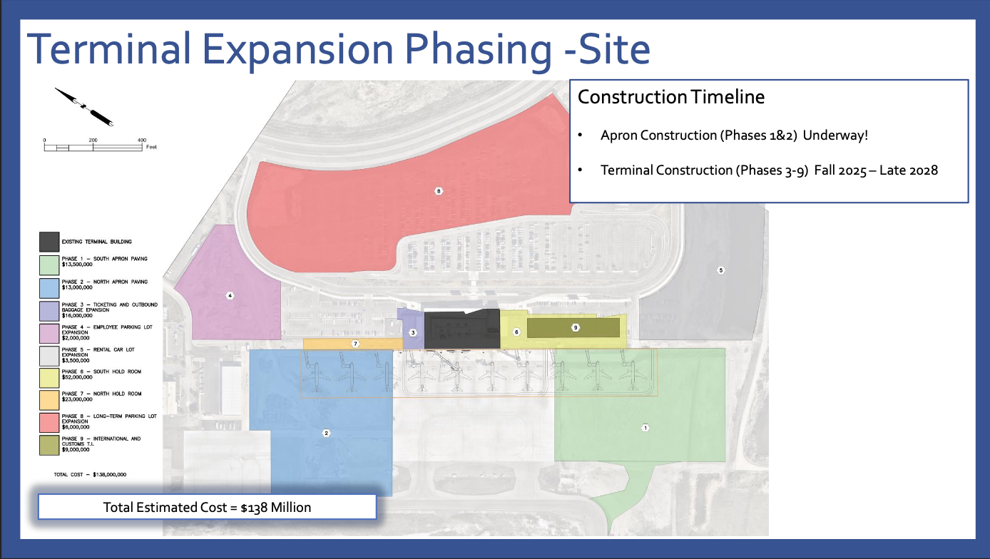 Terminal expansion (Phases 3–9): Scheduled from Fall 2025 through late 2028