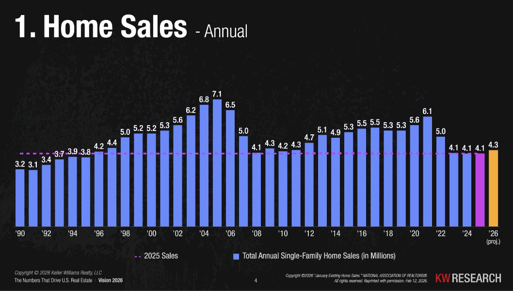 For the past few years, home sales volume has been stuck near historic lows. In 2023 and 2024, we saw only about 4.1 million homes sold annually — well below the long-term average. But here's the good news: 2026 is projected to bring roughly 4.3 million home sales, a meaningful step in the right direction.
