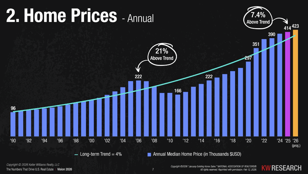The median home price in the U.S. hit $414,000 in 2024 and is projected to reach $423,000 in 2026. That's about 7.4% above the long-term trend line — but compare that to the 18% appreciation we saw in 2022, and things are clearly cooling to a healthier pace.