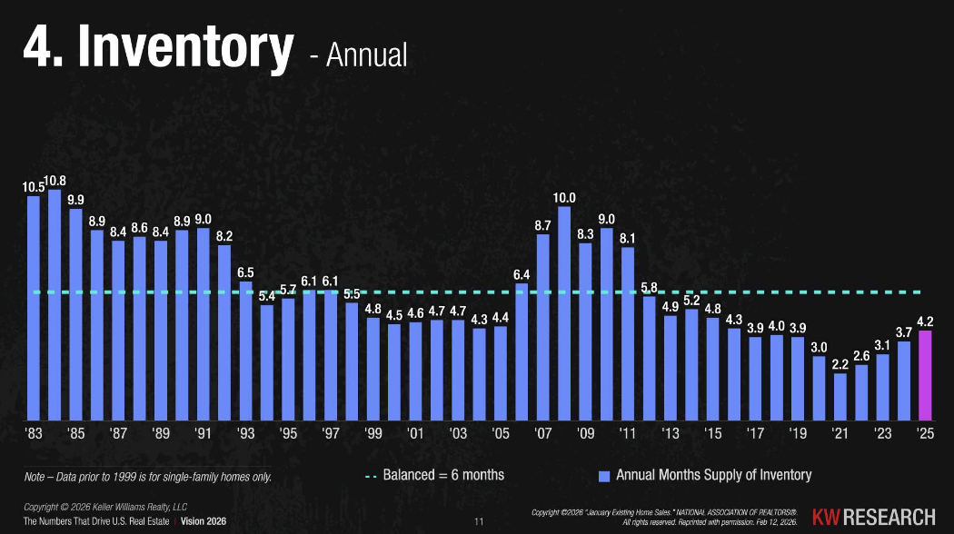 We've climbed back to 4.2 months of supply in 2025, still below the "balanced market" benchmark of 6 months, but meaningfully better. More inventory means more choices for buyers and a little less pressure on sellers to price perfectly out of the gate.
