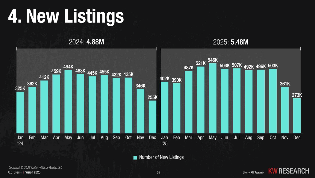 New listings are also rising. In 2025, 5.48 million new listings hit the market, up from 4.88 million in 2024. Sellers are starting to move again.
