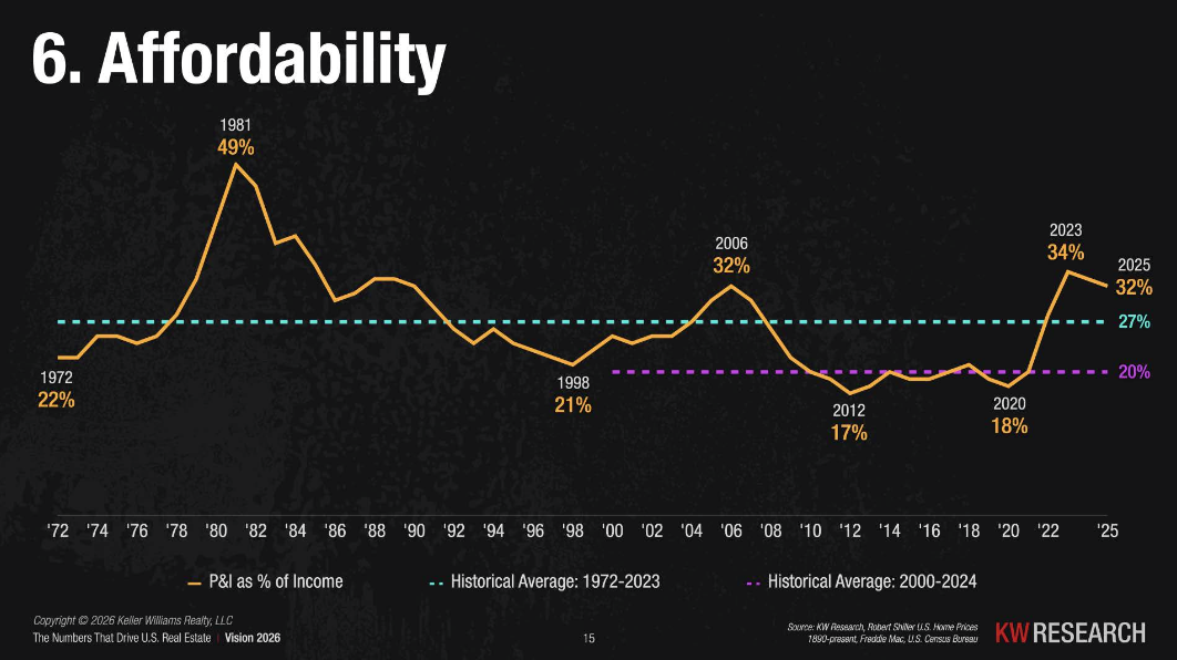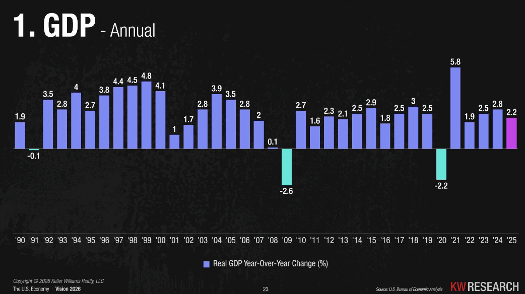 Data sourced from the Keller Williams Vision Speech 2026, National Association of REALTORS® 2025 Profile of Home Buyers and Sellers, Freddie Mac, the Federal Reserve, and the U.S. Bureau of Economic Analysis.