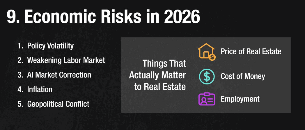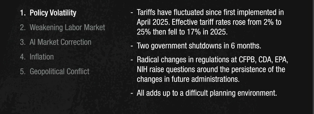 There are real risks worth watching in 2026: policy volatility from ongoing tariff changes, a softening labor market outside of healthcare, questions around AI investment bubbles, and geopolitical tensions. These factors create uncertainty — but they don't point to an imminent crash.